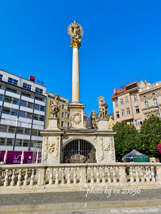 #8.近看瘟疫紀念柱(Morový Sloup).......這座白色鑲金的瘟疫紀念柱(黑死病紀念柱)坐落在廣場的北側,建於1679年,屬於初期巴洛克式風格。