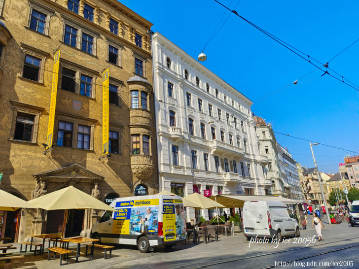 #10.自由廣場(Náměstí Svobody)一隅.......畫面中那棟黃色的建築物是建於16世紀末期的利佩勳爵房屋(Dům Pánů z Lipé),外牆的裝飾是在19世紀才加上去,有著文藝復興風格的 Dům Pánů z Lipé目前做為商業使用......