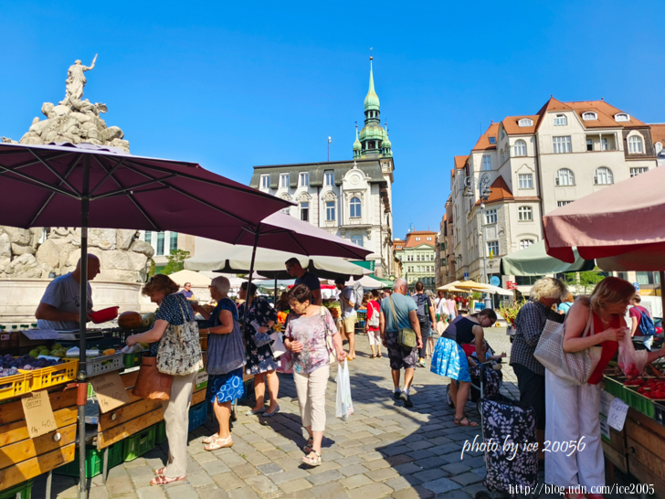 #11.綠色市集(Zelný Trh)一隅.......綠色市集又稱捲心菜廣場,建於13世紀,是布爾諾的一座露天市集,以販賣蔬菜、水果、鮮花及其他雜物的市集。廣場中央佇立著一座噴泉和一座聖三一紀念柱,該紀念柱是靠近摩拉維亞博物館的旁邊。