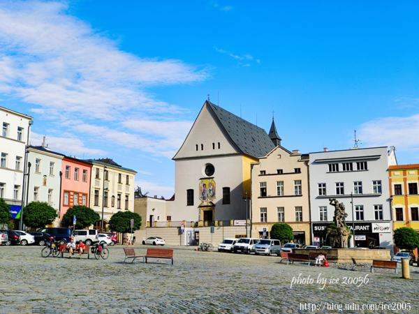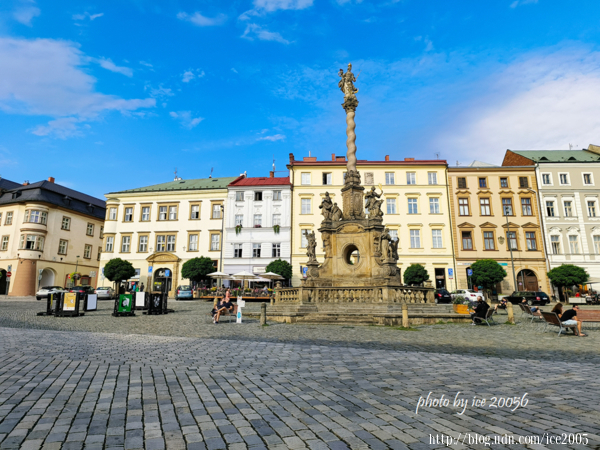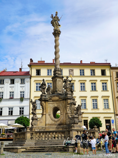 #3.舊城區下廣場(Dolní náměstí)一隅.......從上廣場走過來就是下廣場,廣場上為引人注目的是佇立在廣場中央的瑪麗安柱(Mariánský sloup),和二座噴泉。前方那座噴泉是海王星噴泉(Neptunova kašna),海王星噴泉建於1683年,雕像的創作者是雕塑家克爾·曼迪克(Miachael Mandík);噴水池則是石匠大師瓦茨拉夫·雷德納( Václav Schüller) 的作品。