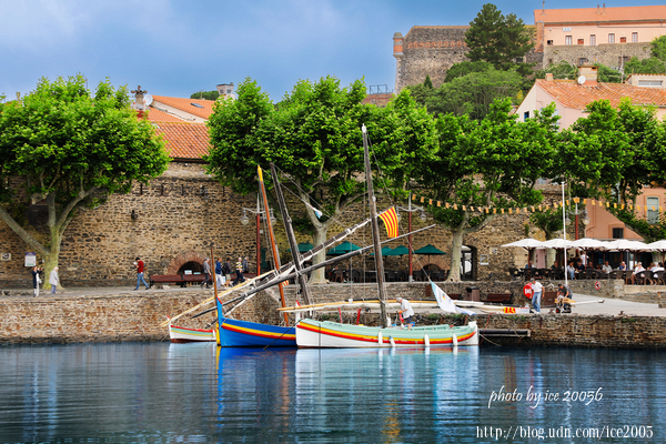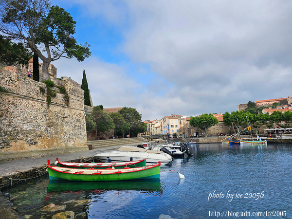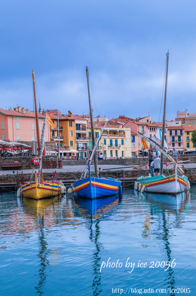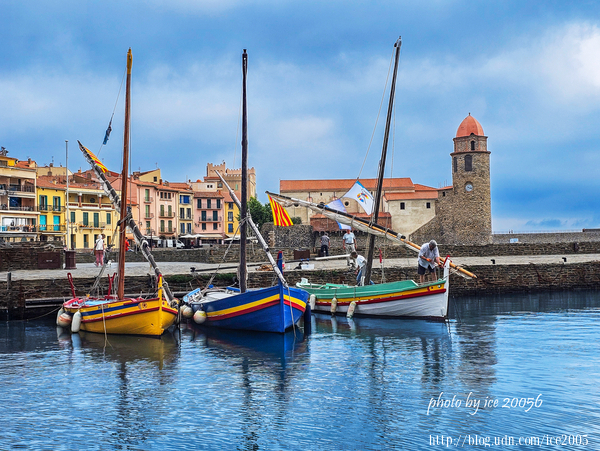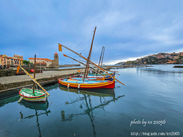 #3.科利尤爾(Port de Collioure)港口一隅......眼前三艘色彩艷麗的小船就是加泰隆尼亞(Catalunya)船隻,在港口,隨處可以見到這些造型精美、色彩艷麗的船隻,最特別的是,船身裝設的傾斜桅杆是從加泰隆尼亞釀酒的羅馬人那裡傳承而來的。
