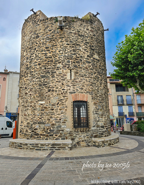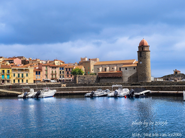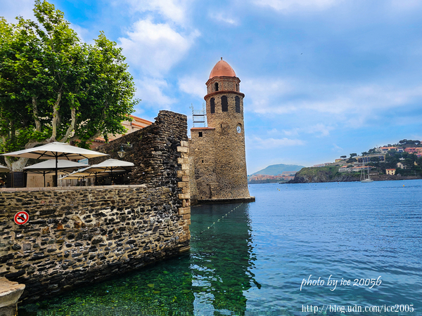 #8.科利尤爾(Port de Collioure)港口一隅......港口這側還有一片礫石海灘,前方那座建築物是天使聖母教堂(Église Notre-Dame-des-Anges),伸入海中的圓塔建築物是教堂的鐘樓,不過,其前身是一座名為科利尤爾燈塔(Phare de Collioure)。