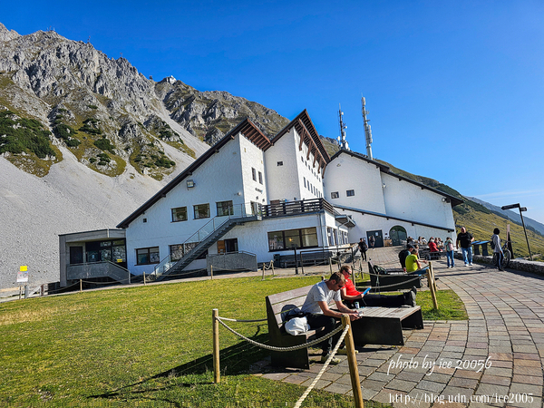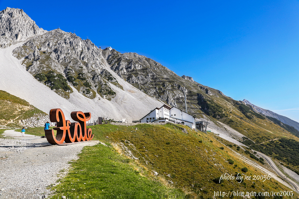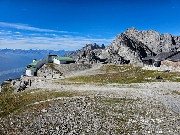 #14.畫面左邊有著淺綠色屋頂的建築物是一家餐廳,其前方也設有一個觀景台,餐廳的另一側是哈菲萊卡(Hafelekar)的纜車站,該條纜車線的名稱是哈菲萊卡纜車(Hafelekarbahn),是連結哈菲萊卡和西格魯貝山之間的纜車,這一站也是北山纜車的終點站。