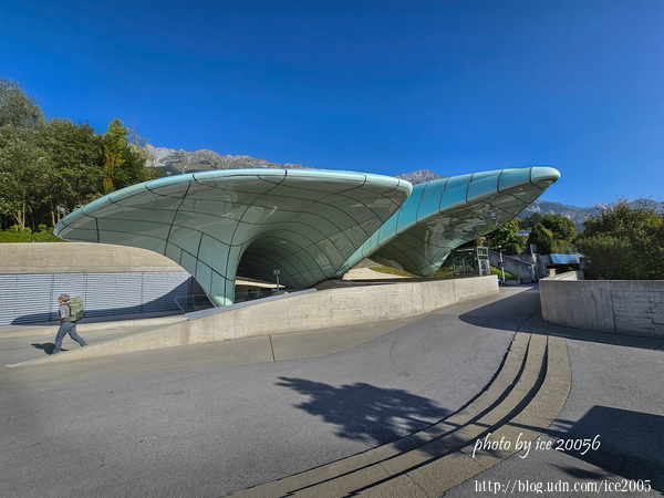 #4.亨格堡(Hungerburg)站外觀一隅......海拔860公尺的亨格堡站是亨格堡鐵路的終點站,要繼續前往北山的山頂必須在一旁的纜車站轉乘西格魯貝纜車(Seegrubenbahn)。另外,亨格堡站和該條路線的另外3個車站一樣,都擁有簡潔的流線型車站外觀,這些傑作皆出自著名的女建築師扎哈·哈迪德(Zaha Hadid)之手。