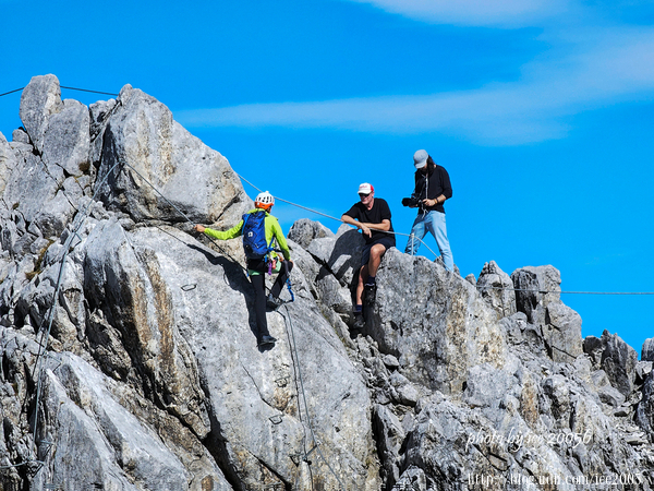 #29.在鐵索攀岩峰頂上的3個人看起來很悠閒,感覺不像在攀岩而是擺拍,瞧!右邊那位持著相機在拍攝呢!