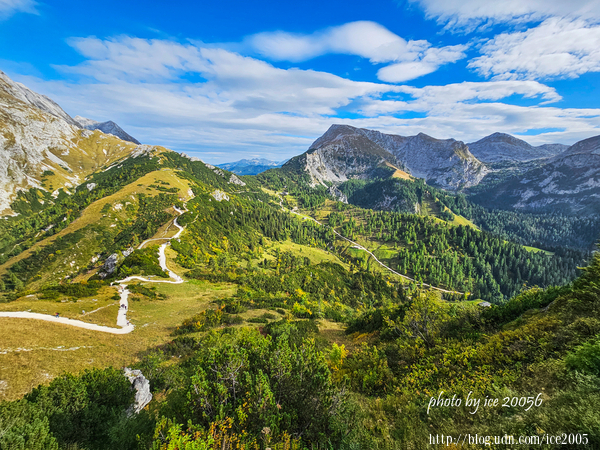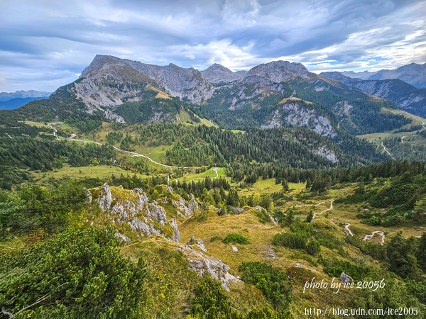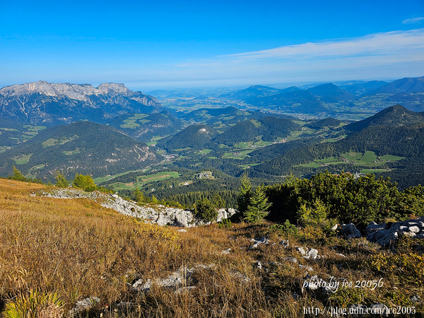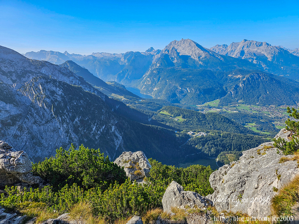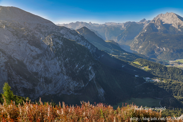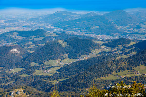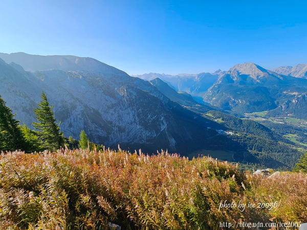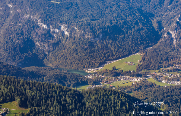 #17.從鷹巢也可以俯瞰位於山谷間的國王湖(Königssee)......畫面中間偏左的河谷水域就是國王湖。