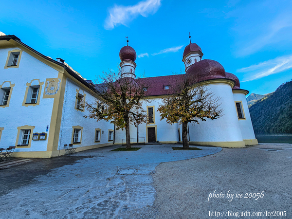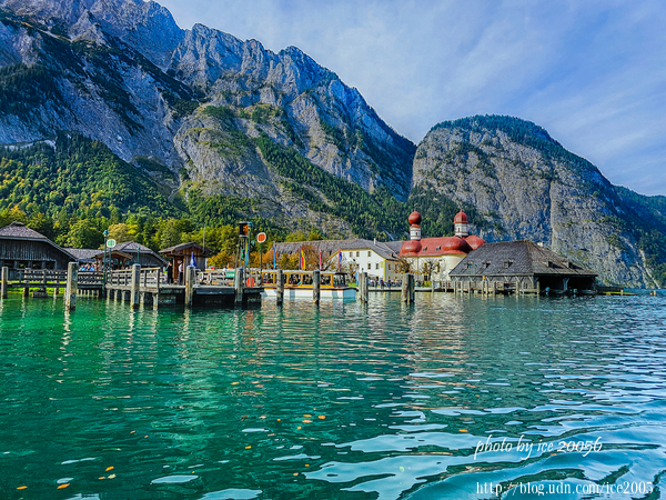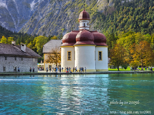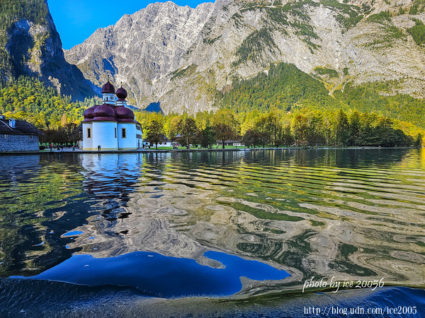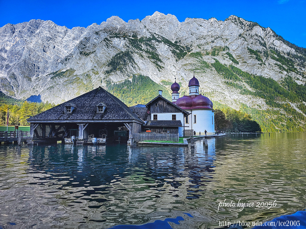 #6.從船上望向聖巴多羅買教堂(Kirche St. Bartholomä)......坐落在國王湖西岸的Hirschau半島上的聖巴多羅買教堂,始建於12世紀,16世紀經過擴建並轉為巴洛克風格。教堂內所供俸的St. Bartholomä是阿爾卑斯山農民和擠奶工人的庇佑聖人。教堂後方那座岩石灰的山脈是瓦茲曼山(Watzmann)。