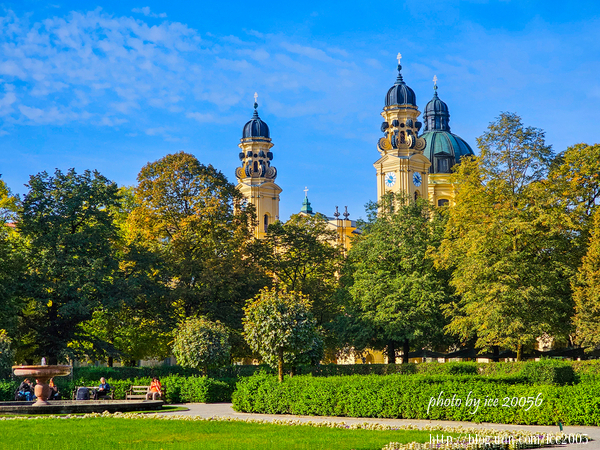 #35.從王宮花園望向鐵阿提納教堂(Theatinerkirche)......前方黃色的建築物就是鐵阿提納教堂,該教堂建於1663年至1690年間,是選帝侯斐迪南·瑪里亞(Ferdinand Maria)與其妻子,為了慶祝其子馬克西米里安二世(Maximilian II Emanuel)的誕生所建造。與寧芬堡宮(Schloss Nymphenburg)相同,皆由義大利的建築師設計,因此帶有濃厚的義大利巴洛克式建築風格。這座教堂也是巴伐利亞王朝的宮廷教堂,許多王朝家族的成員皆長眠於此,包括馬克西米利安二世夫婦的墓塚也位在這座教堂。
