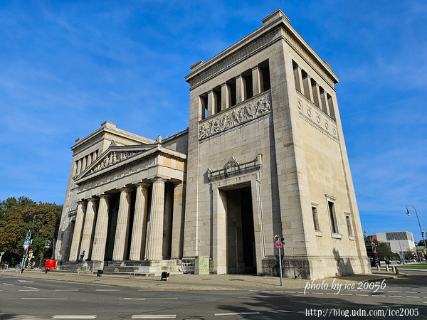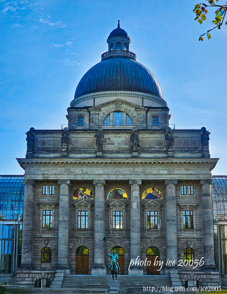#37.近看巴伐利亞邦總理府(Bayerische Staatskanzlei)......總理府中央那座圓穹頂建築物是前巴伐利亞戰爭博物館的遺跡,該博物館於1905年竣工。儘管在二戰期間遭受了嚴重破壞,但它仍然被保留下來,並在其左右兩側增建了現代化的玻璃翼樓。建築物前方那尊騎馬雕像是巴伐利亞國王奧託一世的騎馬雕像。其實在騎馬雕像的前方還設有一座戰爭紀念碑,該紀念碑建於1924年,是為了紀念在第一次世界大戰中陣亡的將士而建。