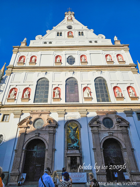 #6.聖米迦勒教堂(St. Michael München)立面一隅.....建於16世紀末的聖米迦勒教堂是一座文藝復興風格的耶穌會教堂,也是德國文藝復興建築之一。教堂的正面設計非常引人注目,帶有典型的文藝復興風格,擁有三層立面的建築結構,中央部分有一個大型的拱門,並在頂部展示了聖米迦勒打敗惡魔的雕像,象徵正義與勝利。
