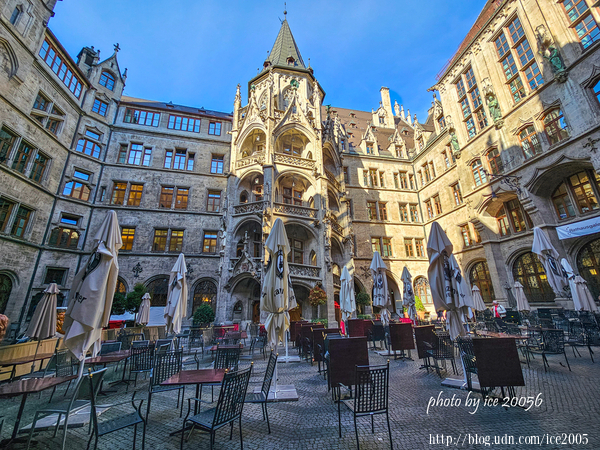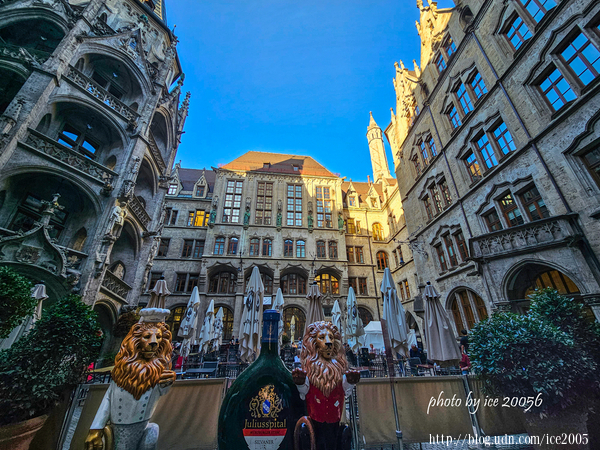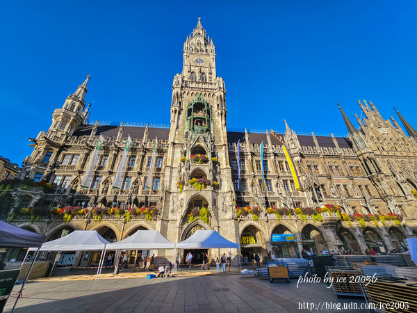 #9.新市政廳鐘樓一隅...... 新市政廳鐘樓高達85公尺,是全德國最大的木偶報時鐘(Rathaus-Glockenspiel),每天的11、12、17時,就會有32個木偶演出歷史劇,內容是1558年威廉5世的婚禮情景。表演時,可以見到鐘樓裡許多彩色人偶分上下兩層排著隊簇擁而出,配合著音樂節奏載歌載舞,惟妙惟肖地再現了當年大婚慶典的場景,持續約10分鐘。