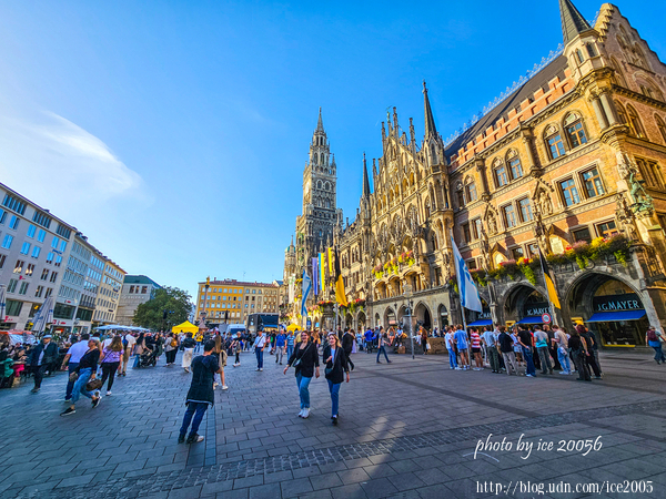 #15.黃昏時分的瑪麗恩廣場(Marienplatz)......熱鬧的瑪麗恩廣場建於1158年,在中古世紀時經常舉行市集及錦標賽。瑪麗恩廣場上建有新市政廳、舊市政廳、瑪麗恩圓柱以及位在角落的古老魚噴水池。