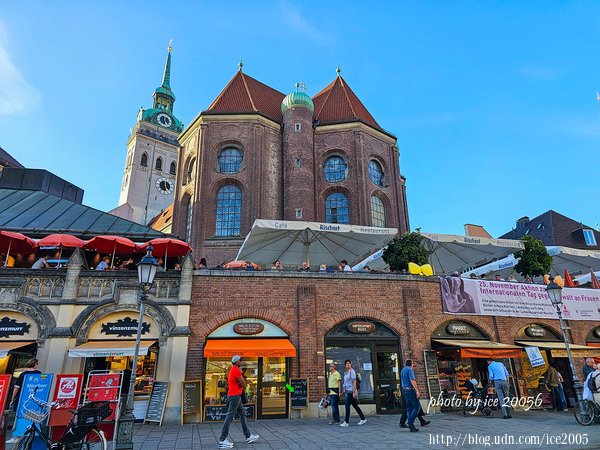 #26.穀物市場(Viktualienmarkt)周邊一隅......前方的建築物就是老彼得教堂(Peterskirche),也是慕尼黑重要的地標之一,老彼得教堂的歷史可追溯至1158年,是慕尼黑最古老的教堂,幾乎與城市本身同年誕生。在漫漫的歲月長河中,曾歷經多次災火與戰爭,經過重建,融合了哥德式、巴洛克與洛可可建築風格,是宗教與建築史的珍貴見證。
