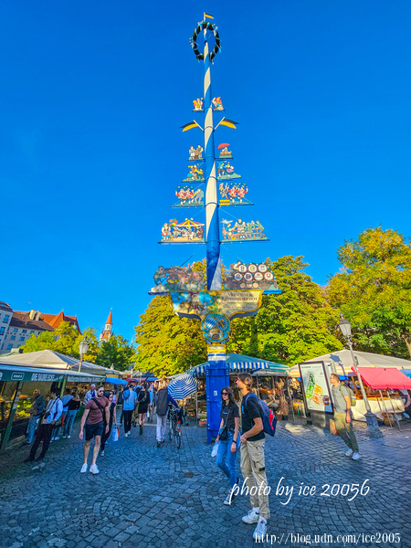 #25.穀物市場五朔節花柱(Maibaum Viktualienmarkt)......五朔節花柱又稱五月柱,高聳於穀物市場上的這座五月柱建於1962年,是由當時慕尼黑的各大釀酒商共同設立。藍白相間的五月柱起源於16世紀,是巴伐利亞的傳統象徵,主要是作為村莊及自治市鎮的代表、展示其所貿易的產品。與巴伐利亞州的其他五月柱一樣,每隔幾年就會更新一次。