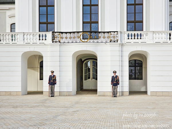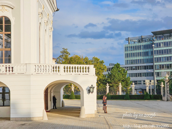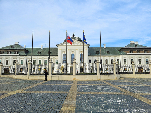 #32.斯洛伐克總統府(Prezidentský palác)外觀一隅......總統府的前身是格拉蘇爾科維奇宮(Grasalkovičov palác),有著巴洛克-洛可可建築風格的格拉蘇爾科維奇宮建於1760年,由匈牙利貴族安東·格拉薩爾科維奇(AntonGrasalkovič)建造的夏宮,也是舉辦上流社會舞會的場所,女皇瑪麗亞·特蕾莎(Maria Theresa)和作曲家約瑟夫·海頓(Joseph Haydn)都曾蒞臨這座宮殿。大約一百年後,它以巴洛克晚期的風格重建;接著在20世紀末期再次重建,自1996年起,成為斯洛伐克總統的辦公處與官邸。
