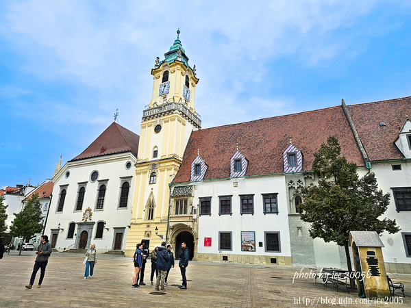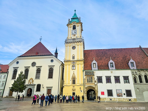 #5.側看舊市政廳(Stará radnica)與鐘樓......舊市政廳是布拉提斯拉瓦最古老的石造建築之一,市政廳塔樓約建於1370年,市政廳建於15世紀,舊市政廳建築群是由塔樓連接三座聯排房子,融合了哥德式、文藝復興時期和巴洛克式建築元素。
