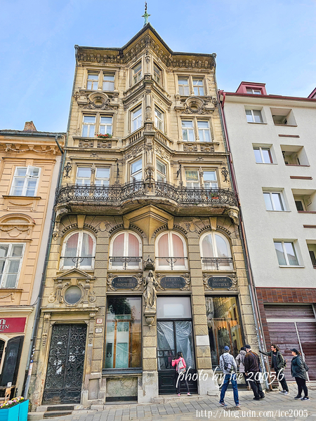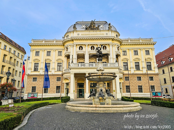 #20.斯洛伐克舊國家劇院(Slovenské národné divadlo)......舊國家劇院建於1884~1886年間,座落在赫維茲多斯拉夫廣場(Hviezdoslavovo námestie)的頂端,屬於新文藝復興時期的建築風格,由維也納建築師F.Felner和H.Helner共同設計。這個劇院的表演廳共有3個部分,分別為:芭蕾舞、歌劇和戲劇。劇院前面的噴泉名為蓋尼米德(Ganymede)噴泉,是布拉提斯拉瓦當地雕塑家Viktor Oskar Tilgner於1888年的雕塑作品,這座噴泉雕像人物背景取材自古希臘神話故事中的美少年蓋尼米德(Ganymede)與宙斯(Zeus)的故事。