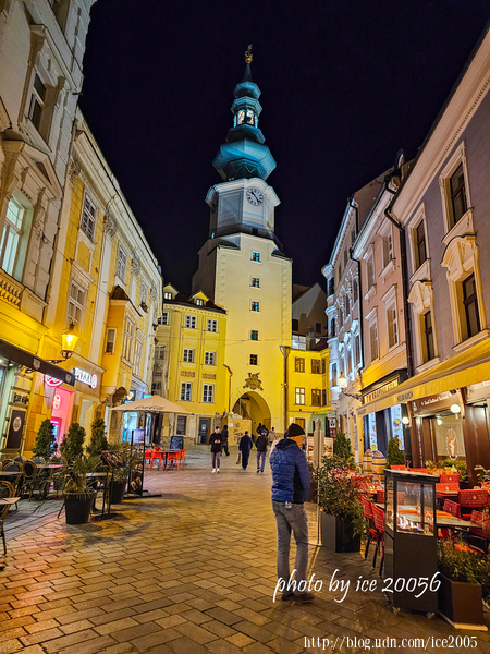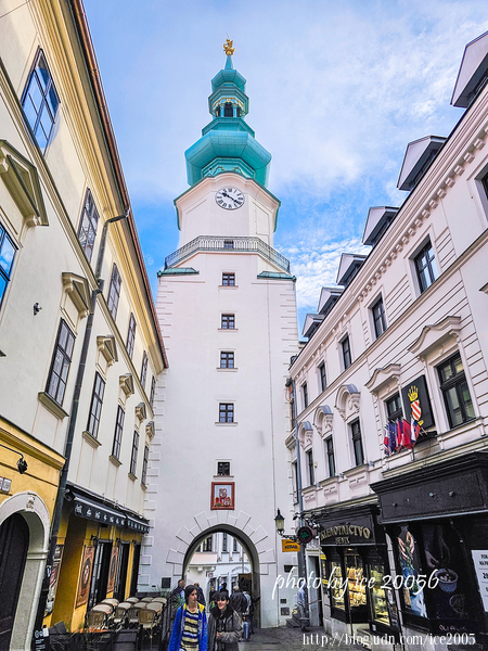 #26.近看麥克爾門(Michalská Brána)......麥克爾門是舊城區重要的地標之一,大約建於13世紀,是布拉提斯拉瓦唯一一座保留的中世紀防禦工事,該建築最早建於13世紀,目前所見的樣式是1753~1758年重建的巴洛克建築風格。城門的綠色尖頂鐘塔高達51公尺,塔頂是天使聖米歇爾的雕像,如今塔內已作為小型兵器博物館(Múzeum zbraní),展示著中世紀的兵器。