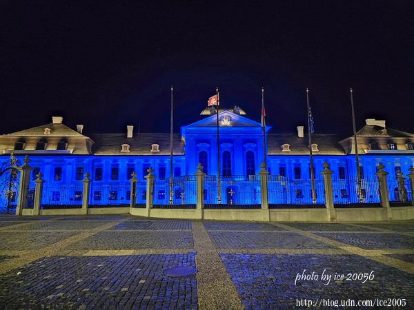 #37.夜色中的斯洛伐克總統府(Prezidentský palác)......吃完晚餐後經過這裡,發現這裡亮起的不是一般的街燈,而是冷色調且氣氛詭異的藍色燈光,覺得這種氛圍很像咱們的農曆七月!