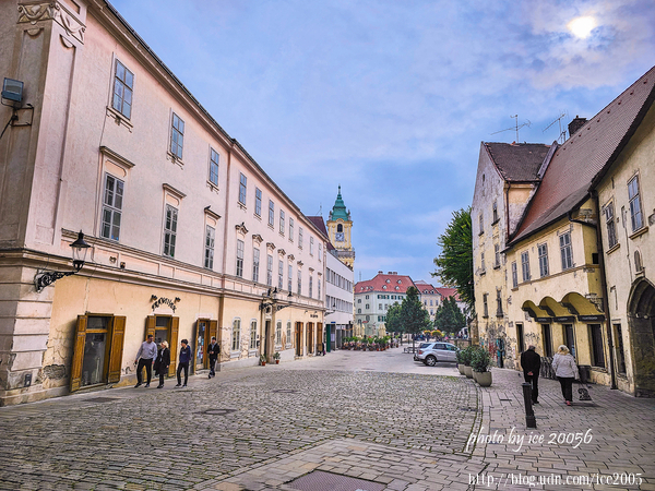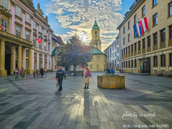 #17.靈長類動物廣場(Primaciálne námestie)一隅……左邊那座建築物是大主教宮(Primaciálny palác),有著新古典主義建築風格的大主教宮,建於1778~178年間,由當時的大主教約瑟夫·巴蒂亞尼(JózsefBatthyány)委由建築師梅爾基奧爾·赫菲勒(Melchior Hefele)設計建造。美麗的主教宮內除了設有一座名為Kaplnka sv. Ladislava小教堂外,還建有仿自法國凡爾賽宮的鏡廳,而鏡廳也見證了歐洲歷史上重要的事件──1805年拿破崙與神聖羅馬皇帝在此簽訂普萊斯堡和約(Peace of Pressburg)奠定了神聖羅馬帝國的結束。現今的大主教宮已成為市長辦公室與音樂廳。