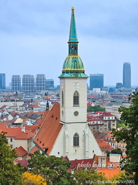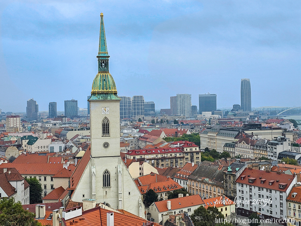#12.從城堡望聖馬丁主教座堂(Katedrála sv.Martina)......城堡下方那座教堂是聖馬丁主教座堂,顯眼的教堂鐘樓高達85公尺,塔頂矗立著一頂鍍金的聖史蒂芬王冠複製品。
