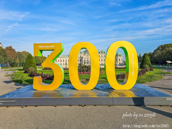 #3.2023年是美景宮(Schloss Belvedere)落成300週年紀念,因此在入口處矗立著300的標誌。有著巴洛克建築風格的美景宮(Schloss Belvedere)又稱貝維德雷宮,完工於1716年,曾是哈布斯堡王朝將軍歐根親王(Prinz Eugen von Savoyen)的宅邸。在歐根親王去世後,美景宮於1752年易手給奧地利女皇瑪麗亞・特蕾西亞(Maria Theresia)。值得一提的是,美景宮雖然不是皇宮,卻與美泉宮/熊布朗宮(Schloss Schönbrunn)、霍夫堡皇宮(Hofburg Wien)並稱為維也納三大宮殿。