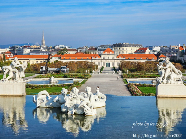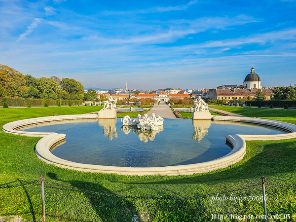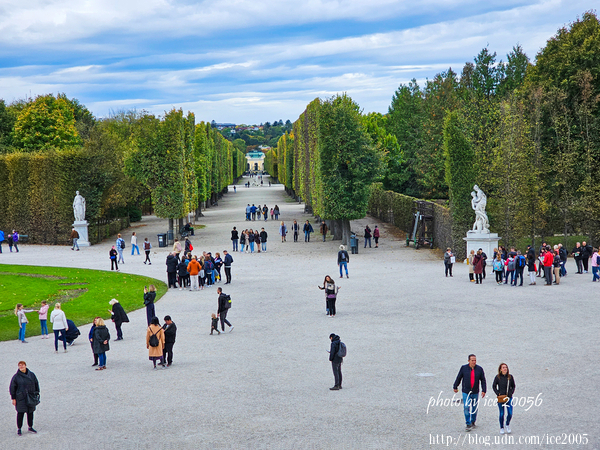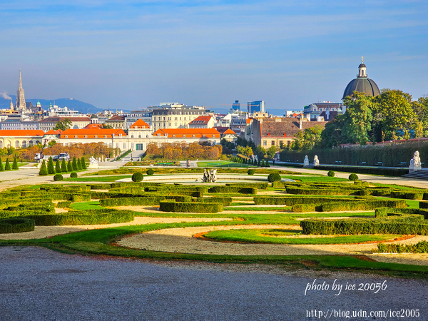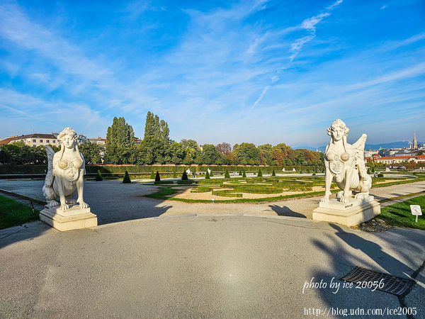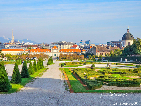 #4.從美景宮花園(Belvedere-Schlossgarten)望向上美景宮(Oberes Belvedere)......美景宮分為上美景宮(Oberes Belvedere)和下美景宮(Unteres Belvedere),上、下宮之間以廣大的法式花園作為連結,昔時下美景宮是歐根親王起居的處所;上美景宮則是辦公及接待賓客的地方。