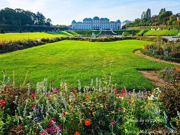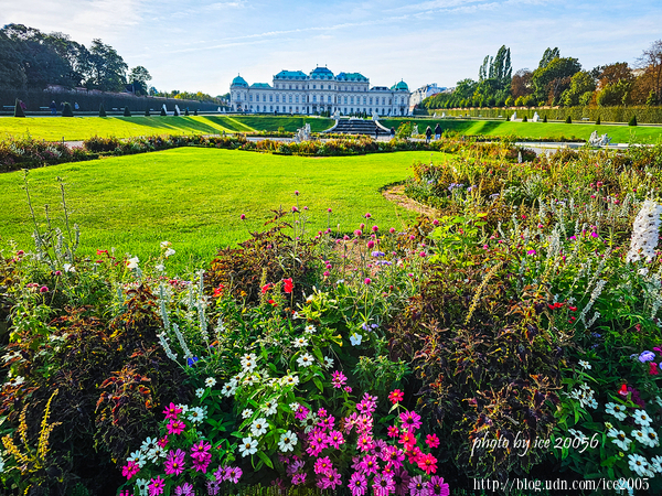#12.從美景宮花園望向上美景宮(Oberes Belvedere)......朝陽下的花兒顯得嬌豔無比,這裡也是整個花園區最漂亮的地方。
