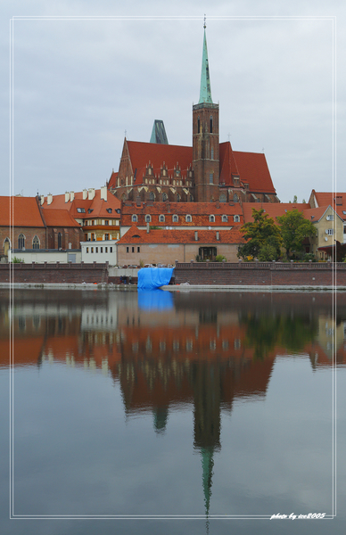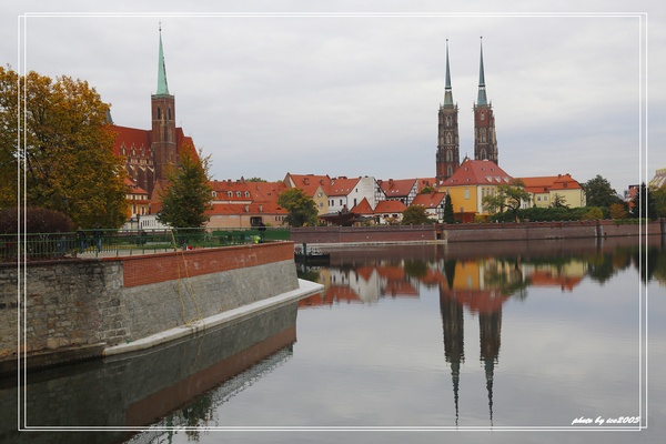 #1.從奧德Odra河畔眺望座堂島Ostórw Tumski上的建築.....左右二座美麗的哥德式教堂倒映在水中.....