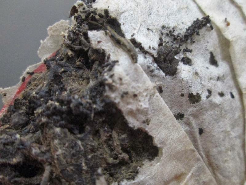 筍殼筒裝上面打印7542,拆筒之後,裏面更是壯觀,每餅茶邊緣的紙幾乎被啃食,掀開紙一看,哇!哇!哇!普洱茶老茶友應該會有如獲至寶的歡呼反應,相反的,大部份的茶友應該是會有噁心加反胃的感覺。