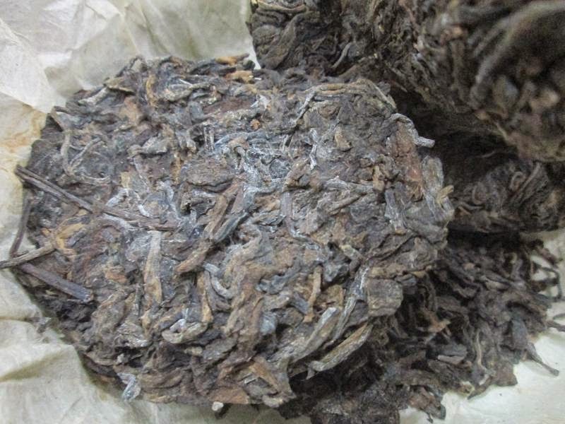 這是一顆讓人看了有點害怕的入倉緊茶,表面佈滿白白的霜,就如同柿餅一樣,其實它是入倉的水氣所造成的現象,神奇的是竹筍殼包著的緊茶已經掛上不少龍珠。