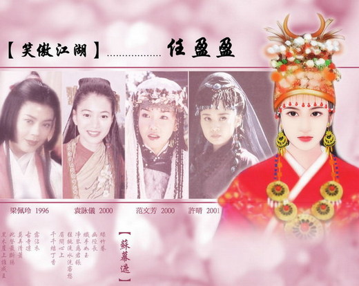 香港在1996年推出由呂頌賢、粱佩玪共同主演的【笑傲江湖】,其實梁佩玪的相貌並沒有金庸筆下所描述的美豔超群,但是她仍然將任盈盈溫和體貼的特質表現得可圈可點,一顰一笑的柔情神韻、焦急薄怒的細膩情緒也拿捏得恰到好處。