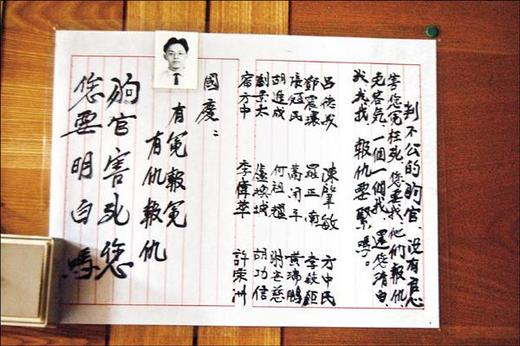 江爸爸生前在牆上釘著一張為江國慶定罪的軍方官員名單,上寫著,「判不公的狗官,沒有良心害您冤枉死,您要我,他們報仇,免客氣,一個一個,我還您清白,我、我、我,報仇要緊嗎?」,「國慶:有冤報冤,有仇報仇,狗官害死您,您要明白嗎?」其中,許榮洲名列其中。