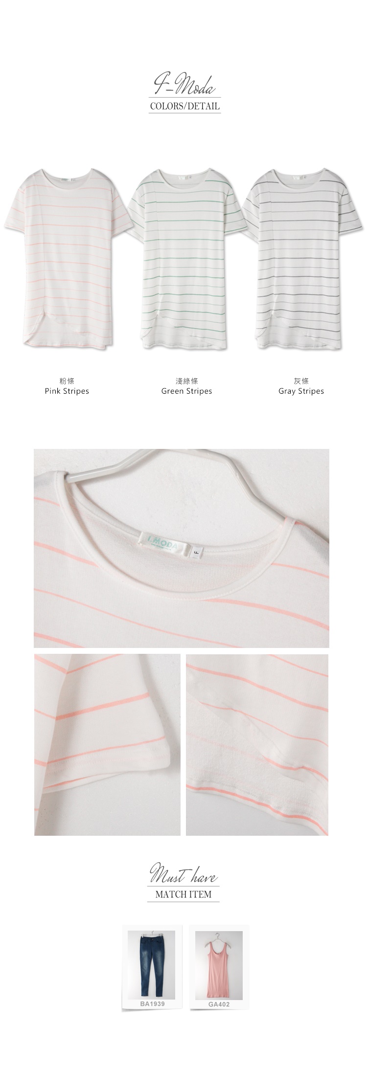 0524新品 橫條紋側剪裁開衩造型圓領短袖長上衣.3色