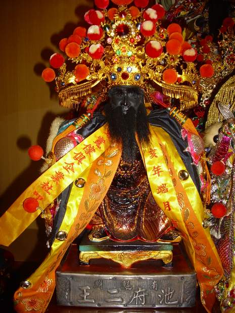 二王姓池名夢彪,陳留人氏,文質仁心,天資聰穎,性情剛直,治軍嚴正,用兵如神。唐高祖入關時,因助唐開國有功,授封中郎將、折衝都尉。貞觀17年(643年),隨唐太宗親征高麗國(即後來的韓國),勢如破竹,又加封為宣威將軍。池府王爺是一位文質彬彬的神聖,為何金身造型是黑臉,眼大如豆,看起來威嚴無比呢?傳說池府王爺某夜夢見一位瘟神,奉玉帝旨令下凡降災、散佈瘟疫,池王知道這件事後,便請這位瘟神到府中飲酒暢談。瘟神暢飲之後,已有幾分酒意,就吐露下凡之意,池王心腸慈悲,害怕百姓受災,託言借看藥粉,趁瘟神不注意時將那包瘟疫粉全部吞下。藥粉進入池夢彪腹中,藥性發作,隨即滿臉變黑,兩眼突出而亡。瘟神帶著池夢彪的靈魂參見玉帝,玉帝感念祂愛民救民的精神,敕封祂為代天巡狩池府千歲,六月十八日為聖誕千秋。