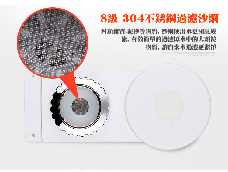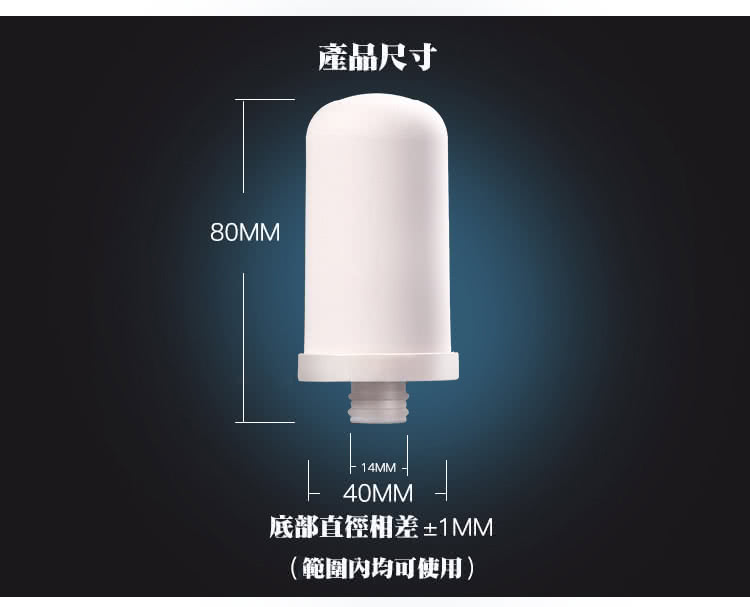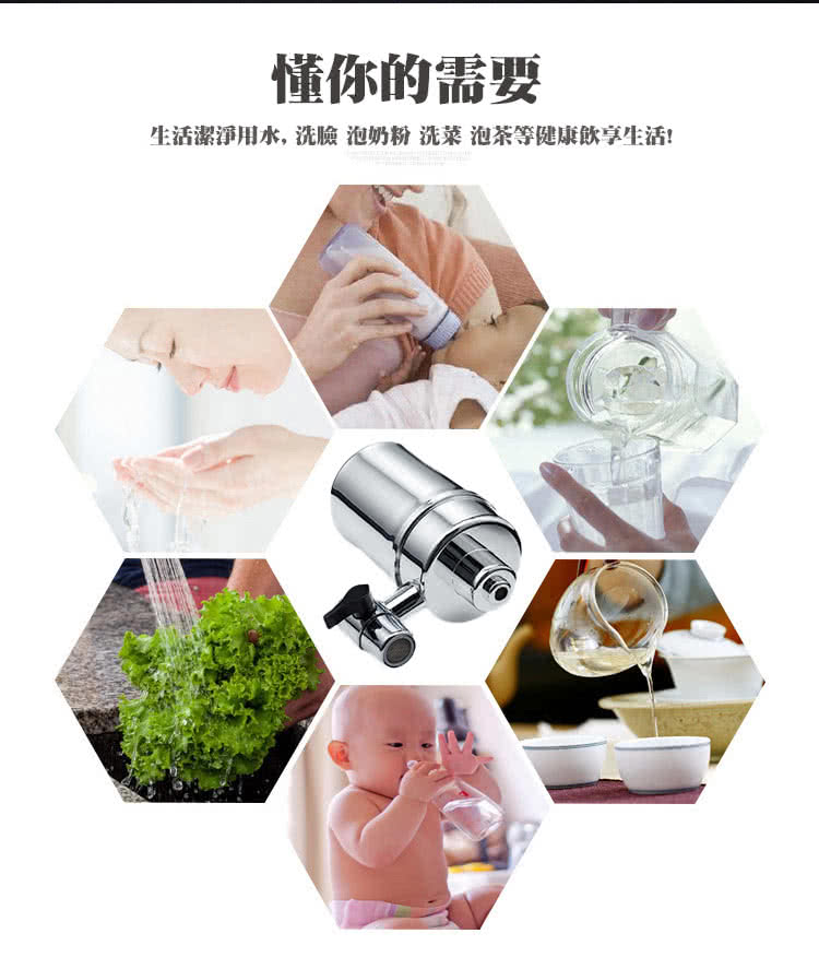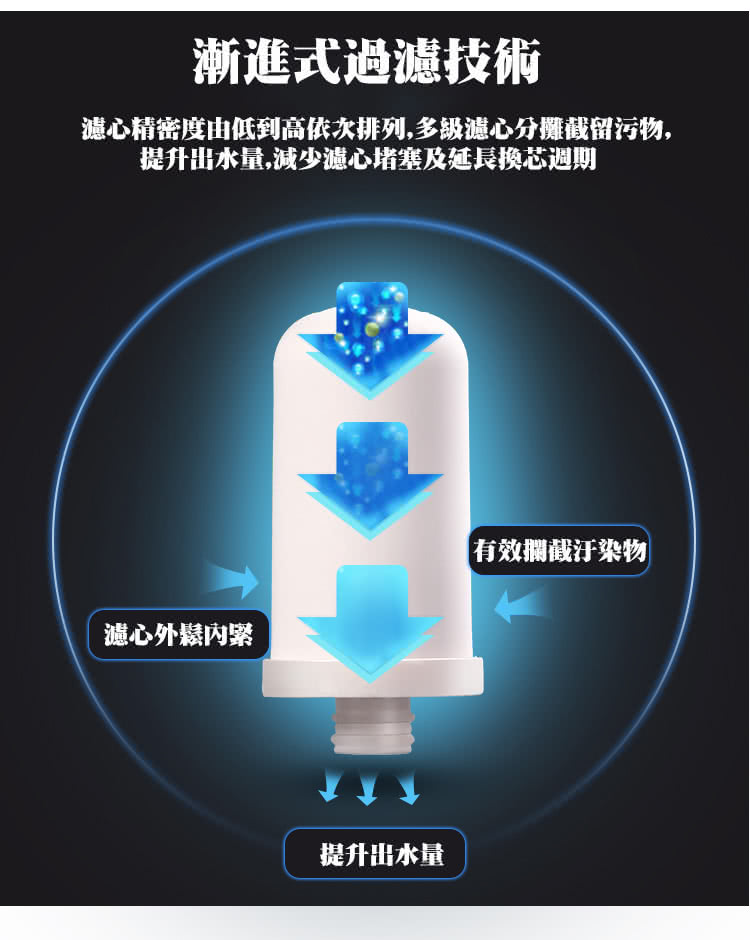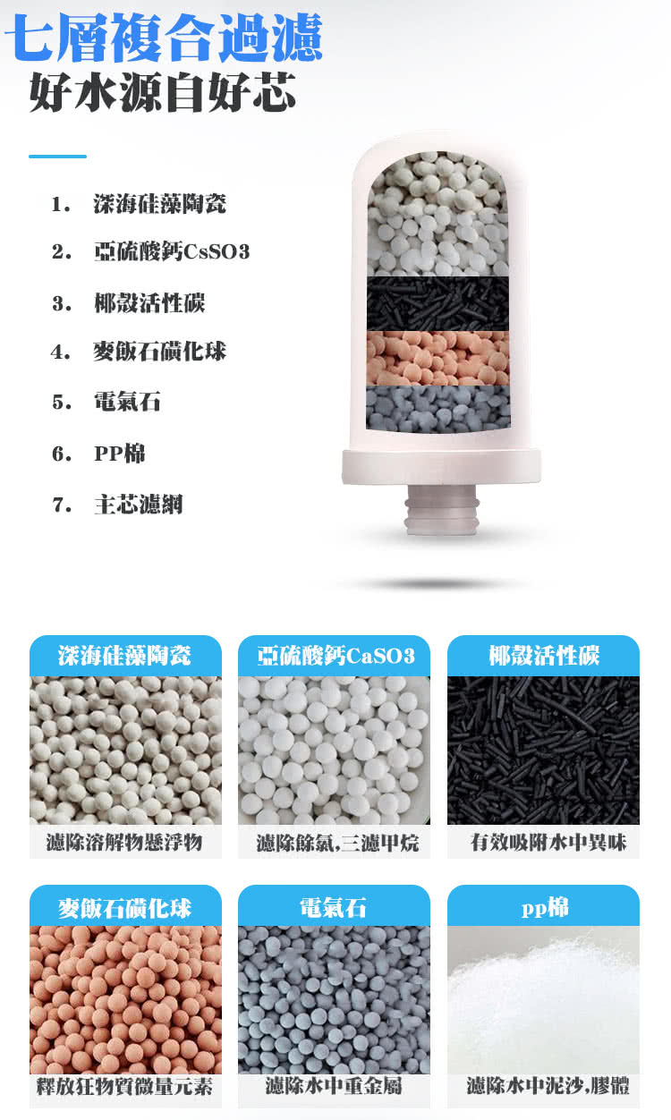 濾心材質:硅藻陶瓷、亞硫酸鈣、椰殼活性碳、麥飯石、電氣石、PP棉、濾網