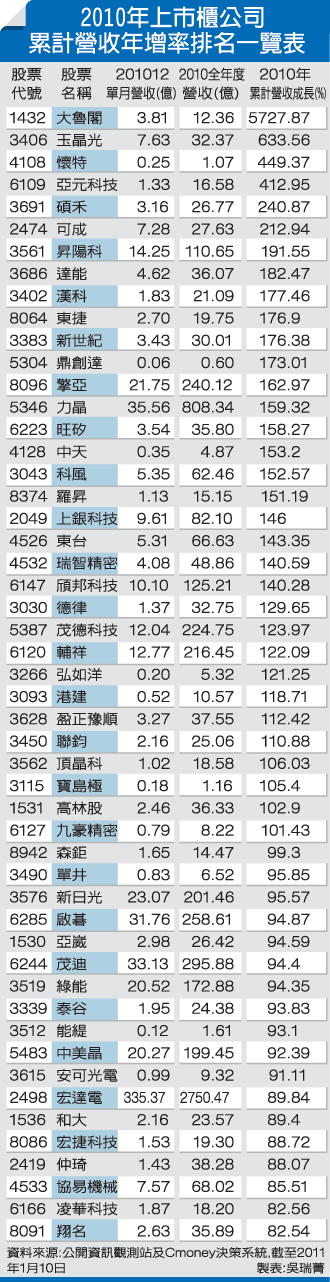 時序揮別了2010年,2010年全年的營收數字也陸續公布,根據CMoney決策系統統計顯示,台股上市櫃公司2010年非合併報表全年營收年增率1倍以上逾30家,年增率8成以上逾50 家,相當亮眼,其間不乏年營收在百億元以上的公司,如力晶 (5346)、茂德 (5387)、新日光 (3576)、啟碁 (6285)、茂迪 (6244)、中美晶 (5483)、宏達電 (2498)等。尚未公布的鴻海將篤定衝破年增率50%,迎向60%,全年集團合併營收挑3兆元躍居第一,下午公布的廣達,將衝破兆元大關居次,年增率可望挑戰50%大關。