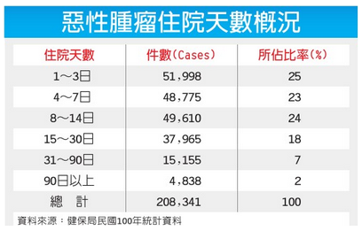 以民國100年健保局的統計資料,惡性腫瘤(即癌症)的平均住院天數為20天,可能遠比你想像中癌症需要的住院天數少很多。其中住院天數小於30天比例佔91%。以一般規劃癌症住院日額3000-5000元,住院20天理賠金額只有6-10萬,也是遠遠不敷癌症標靶藥物的給付!