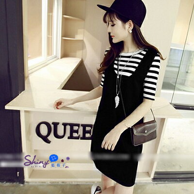 ~399超商免運 599折30 輸入代號 M7OJ-IPQJ-ZB18-R5YO【V1768】shiny藍格子-輕著休閒.條紋圓領短袖上衣+背心寬鬆裙套裝