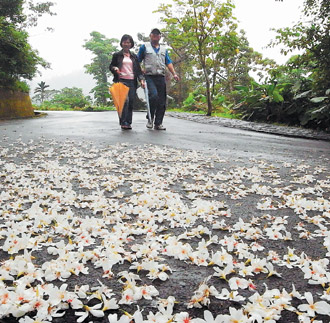 「看桐花不用到苗栗」,宜蘭縣冬山鄉仁山植物園的桐花正綻放,雪白的花朵隨風飄下,散落步道,猶如一片柔軟的純白地毯,美景迎賓,吸引遊客踏青,還有國小老師撿拾花瓣,帶到學校當活教材。