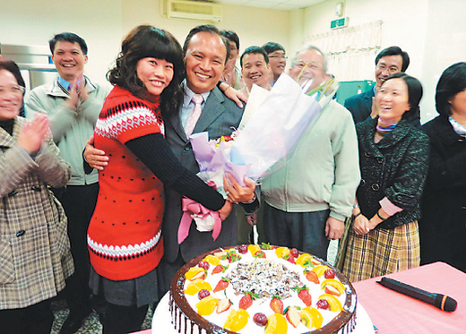 獻上一束鮮花,鎮公所員工拍手祝福林聰賢,還有女同事上前擁抱,「你是我們心目中最棒的鎮長」,有女員工紅著眼眶說。