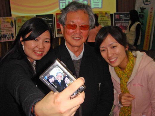 小說家黃春明很受歡迎,時下自拍盛行,年輕女記者邀他自拍合影,留下這樣的鏡頭。