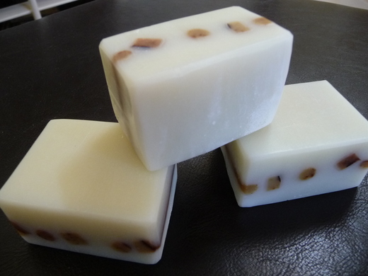 我很喜歡蓖麻油入皂。作皂時,若加入蓖麻油,皂體會有點透明感,而我愛的就是這份晶瑩剔透。(可惜,在照片中無法呈現出這晶瑩的質感。)