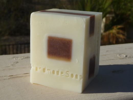 動手作之後,問題來了,添加物的比例應該多少?另一方面,我又很貪心,想借由深淺色差,甚至調和添加物,多生出幾樣顏色來變化。東調西弄的結果就是做出了許多深色的皂塊,不管它原來應該是綠色的,棕色的還是淡紅色,因為添加的比例不當,都成了深顏色。在一片深的情況下,我索性放棄原計畫,利用皂條的放置位置,做出這款幾何心情。從每個面看去各有不同的構圖,切皂時,我還讓每個邊長儘量相等,不要顧此失彼。