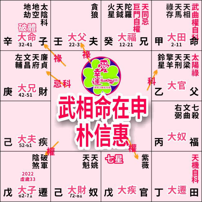 以朴信惠的夫妻宮化天梁祿入父母宮照疾厄宮(配偶喜歡朴信惠的脾氣,關心照顧她的身體健康),剛好是朴信惠32-41歲大限的夫妻宮。2022年朴信惠虛歲33歲,這個大限配偶跟她有緣。夫妻宮化武曲忌入命宮。就配偶來說是會關心糾纏(忌入主糾纏,忌沖主無緣)配偶如同全心全意在朴信惠身上。