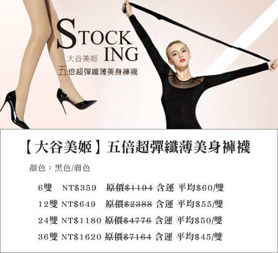 平均每雙最低只要45元起(含運)即可享有【大谷美姬】五倍超彈纖薄美身褲襪6雙/12雙/24雙/36雙,顏色:黑色/膚色。