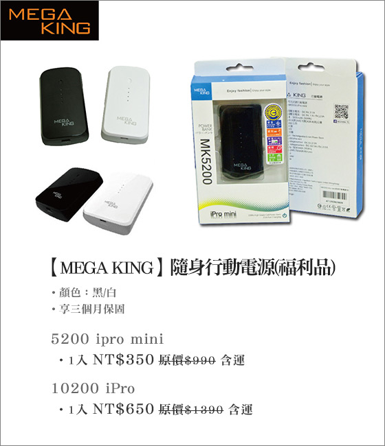 只要350元起(含運)即可享有【MEGA KING】原價最高1,390元隨身行動電源(福利品)1入:(A)5200 ipro mini/(B)10200 iPro;顏色:黑/白,享三個月保固。