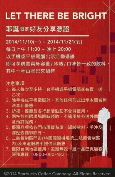 活動說明:以手機或平板出示此憑證,即可享購買兩杯相同口味/容量/冰熱皆一致的飲料,其中一杯由星巴克招待。