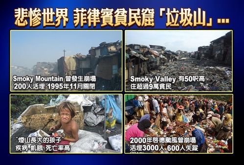 菲律賓本土有兩座世界有名的「垃圾山」,一座是Smoky Mountain,是世界最大的貧民區。由於環境骯髒,百病叢