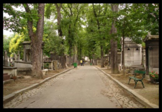 黃昏向晚,雨已停陽光再度露臉,靜謐的墓園裡遊客已少,行走於綠蔭處處,乾淨的墓園路徑上,比對著地圖上的人名,兩旁的墓碑經常有許多驚喜,各式各樣的造型,還有雕塑來彰顯此地所葬之人的地位與生平。新舊錯落,有些墓石發亮鮮花處處,有些斑駁字跡模糊,雖受限於知識不足,法文不識,然而在經過那一座座生命終點的長眠地時,仍可感受到歲月流轉的美麗痕跡。
